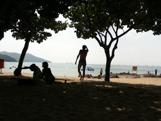 Next day – refreshed – we got a bus to Stanley. Jim did a 17 mile run while I sat in the shade, read my book and wandered around the new Stanley shopping mall. After a spell of sunbathing (in the shade) on the nearby beach, Jim followed up his run with a half hour swim (inside the shark nets) and then a little light shopping in Stanley market.
