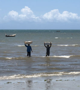 Fishermen were emerging from the sea with boxes of fish on their heads. Crowds were gathered around buckets overflowing with tiny fish. Like all market, putting buyers and sellers together creates noise and excitement. In the background bobbing in the shallows were the fishing boats.