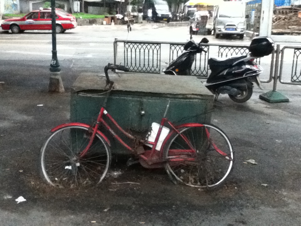 You have to be careful where you chain your bike up in Nanjing. Look around you – can you see any workmen resurfacing the road? If not, you are probably safe but if there’s even a slight sniff of tarmac, make a run (or pedla) for it. The owner of this beautiful red bike did not heed this advice and locked it to a metal box.