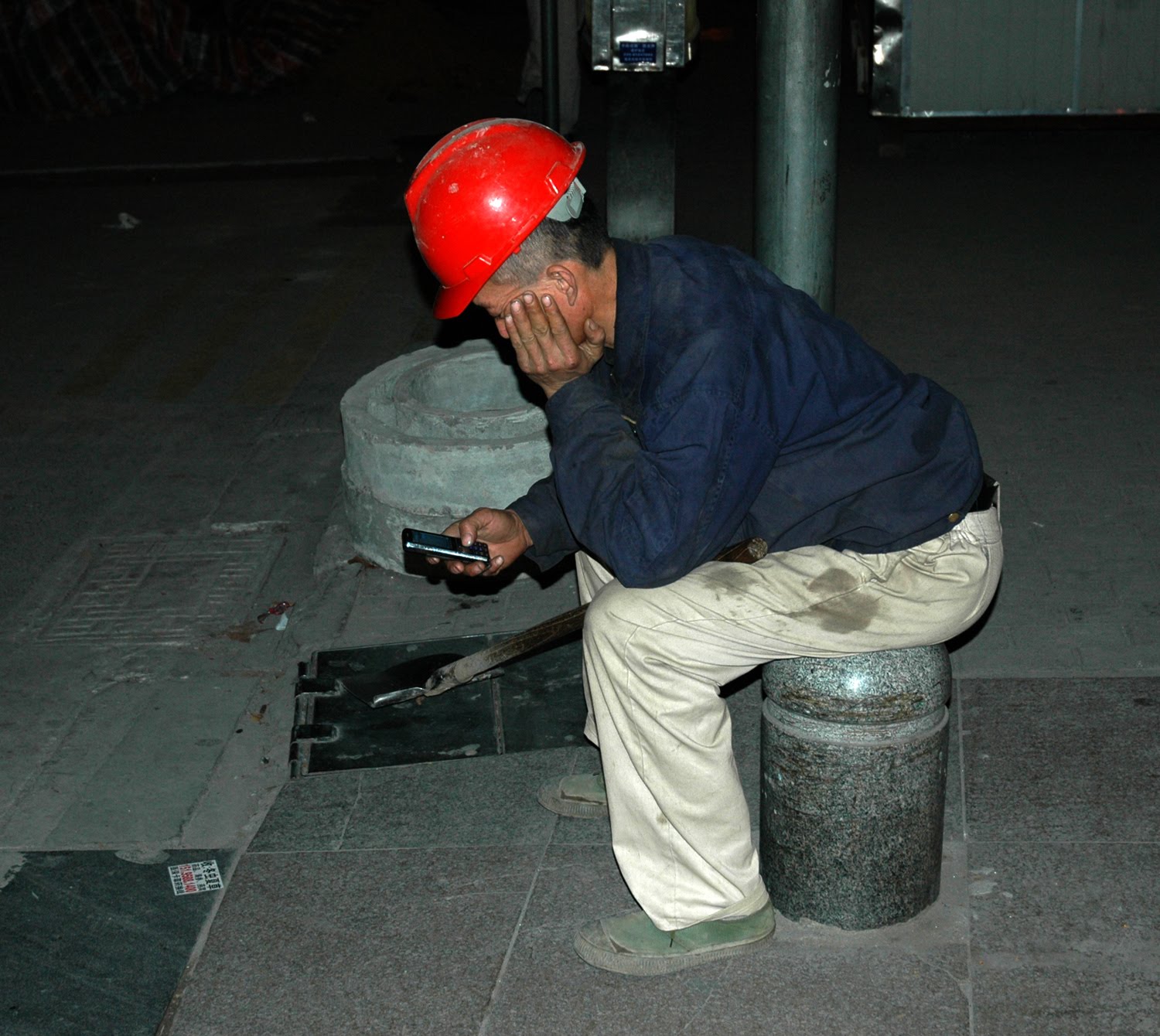 So I go out for a walk and see what’s happening. Nanjing is rebuilding itself and everywhere you go at night there are builders hammering, banging, drilling, cranes lifting huge pieces into place and dust choking the air we breathe. It is relatively easy to take pictures of builders as they are often standing around looking bored waiting for something and are pretty friendly.