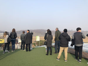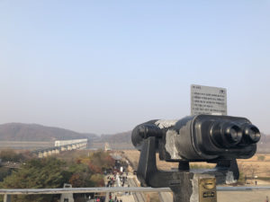 When we all filed back on the bus, she helpfully handed us a map and a guide to park! Then it was off to the viewing point where we could get a clear view of the DPRK. That is, a clear view on a clear day. Today was not a clear day and we all stood there, peering through binoculars into a thick screen of greyness. As she helpfully explained, the landscape is actually just like South Korea but there are no trees because they’ve had to cut them all down for fuel. So the hills are bare.