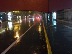 The rain started and then the thunder and lightening illuminating the soaking street and the people battling through the storm huddled under their umbrellas.