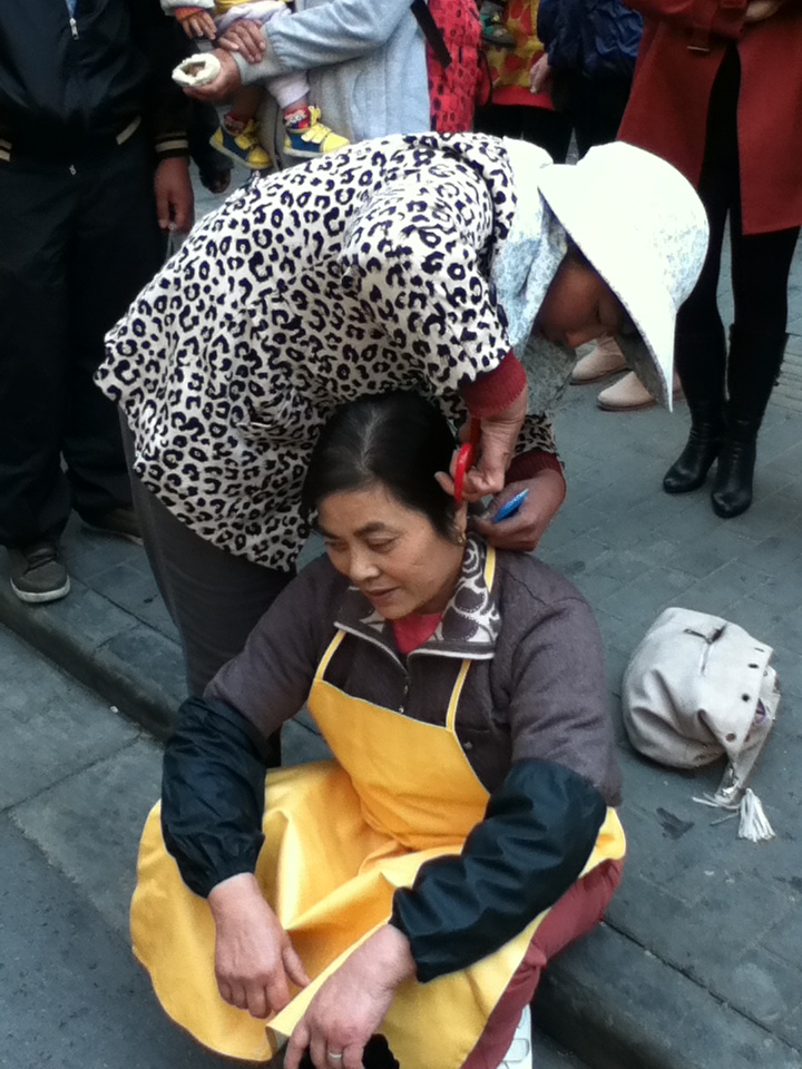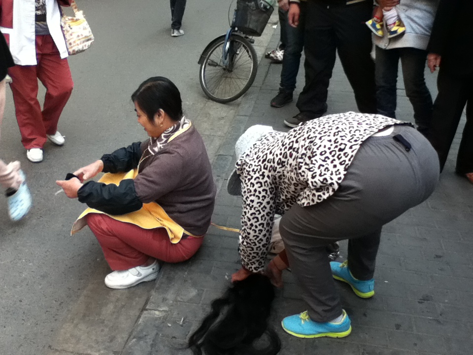 Then I saw a small group of people huddled around a woman sitting on the very dirty curb (always wet with urine as it’s opposite the children’s hospital). There was another woman looming over her and as I got closer I could see that she was cutting all her hair off. It wasn’t just a trim, she was removing the whole lot.
