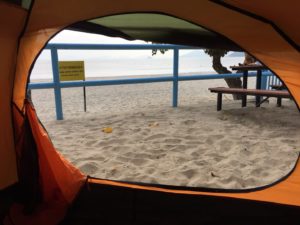 In my mind, I had the idea that camping on a beach would be exotic. I would open the tent in the morning and look out over clear blue seas and fluffy white clouds.