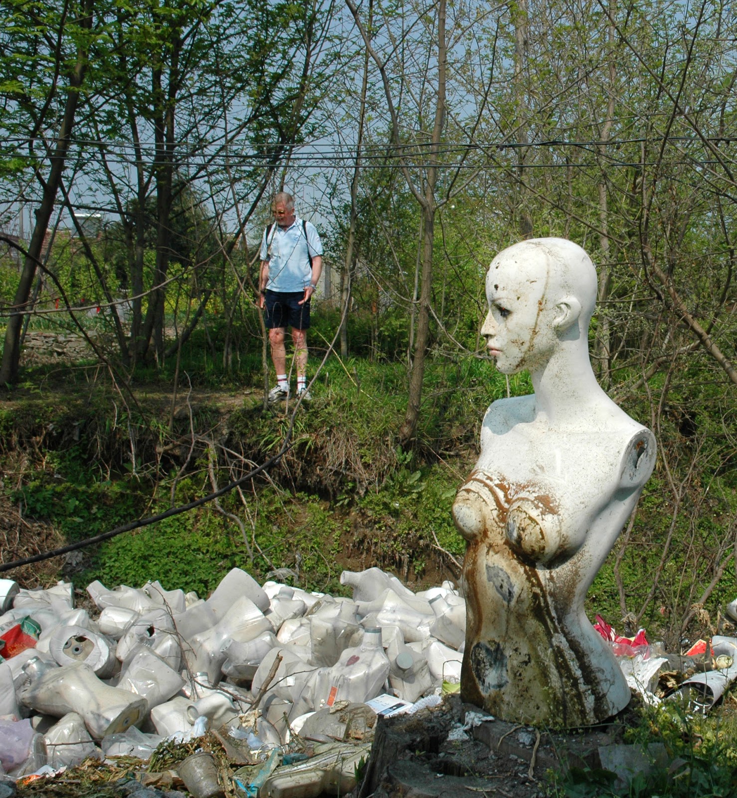 We landed on the island in the Yangtse and cycled along the near bank looking back towards Nanjing city. We cycled right along the edge of the island, to our left the banks of the Yangtse and to our right lots of small old houses. Some had courtyard with birds hanging in cages and beautiful tulips in pots and flowering trees. It was a magnificent sight. We cycled on and down lanes until we found what I had discovered on my previous trip – the mannequin pond. Can you believe – a pond full of mannequins! This was a real mystery for the Famous Five. We looked for clues but found none – spoke to some locals but could not make ourselves understood. It was a strange sight indeed.