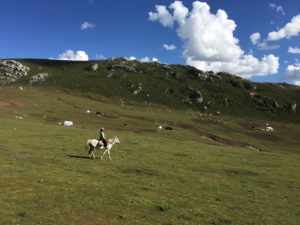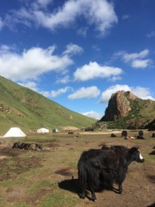 All around this area the mountains are dotted with white nomad tents and black yaks, against a landscape which seemed unreal – bight blue skies and deep green grass. The weather was ideal – warm and bright and making a hat a critical piece of kit.