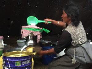 After making the bread, she headed back out to the yaks and spent another hour or so milking them. She came back in as Chi and I and her husband (our guide) were still lying in our sleeping bags. I crawled out of my sleeping bag feeling very weak as a result of the altitude and partially because I had had almost no sleep thanks to the dog barking all night long next to the tent. I don’t know how anyone else got any sleep.