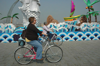 For the first time we were able to go past the iron gate and onto the previously closed section of the wall. Soon we came across a stall renting bikes and we rented one each for £2 for an hour. It took the man on the stall quite a while to lift the seats and handle bars up for us so we could actually ride them. In any case, by the time we brought the bikes back, my seat had slipped down so I was almost on the ground! In the sun we started off along the wall, stopping occasionally to look over the wall to see the old