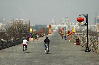 From the top of the wall we could see as far as the city centre and into the Confucius temple. It being a Wednesday afternoon there were few people on the wall and we cycled on in the bright sun, our coats in our bicycle baskets.