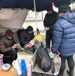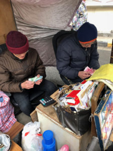 The money changers sat under their umbrella counting the notes quickly in the Chinese style and putting them in bundles in a pile on the floor and making a note of how many bundles, on a notepad. The woman continued to hand over the bundles for counting as people wander past seemingly disinterested in the massive amount of cash.