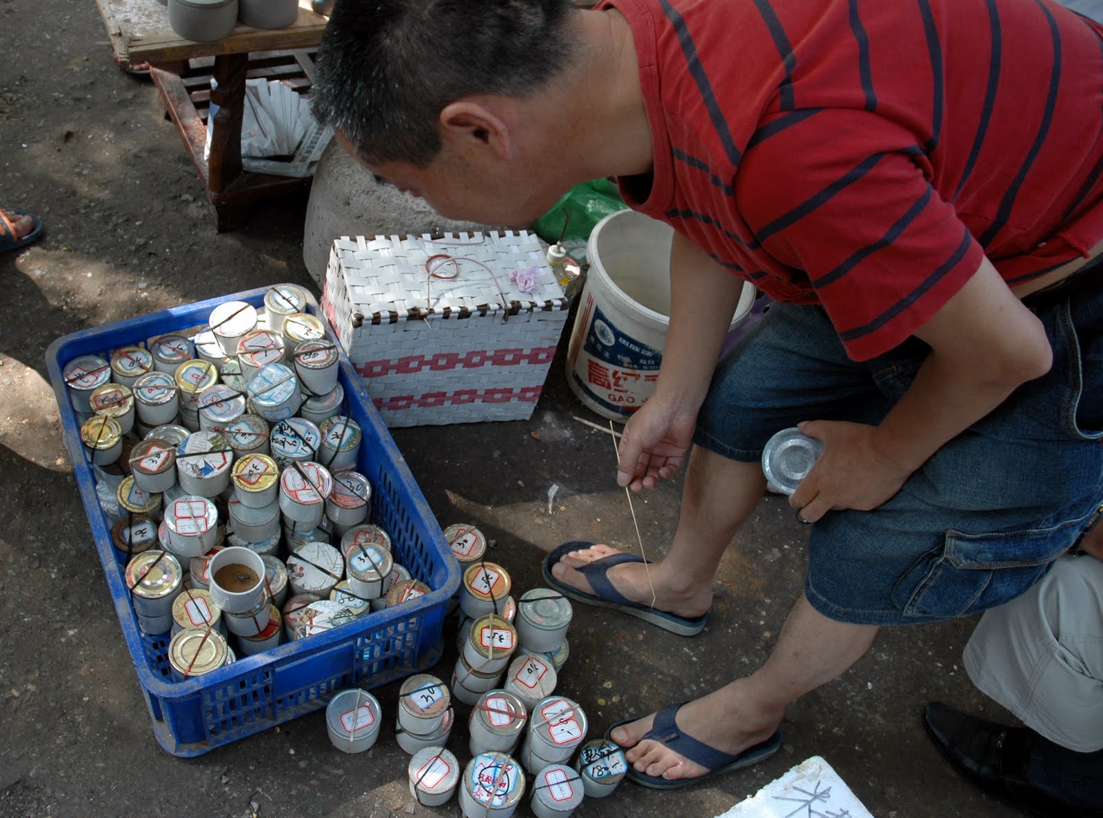 As I wandered further down the road I was tempted into a small market area where I found various sizes of cages full of song birds, buckets of small turtles and hundreds of tins of crickets for sale. I decided to purchase a cricket and after looking at several, found a small but handsome one which I negotiated down to 50p. I bought a little cricket handling net and rushed back to the pavement location with my brave fighter.