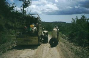 We set off early, and before long I persuaded Pat to give a lift to a small boy walking along the road. Unfortunately he was sick all over everyone in the vehicle, and I was blamed for the whole incident.