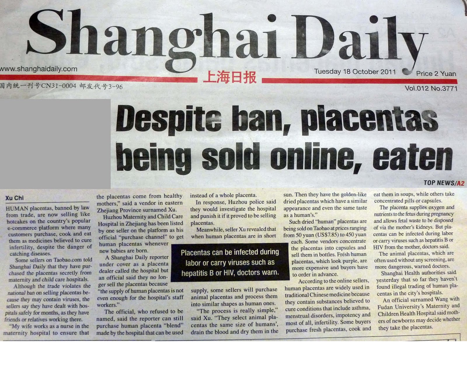 Shocking story in the Shanghai Daily about the illegal trade in fresh placentas.