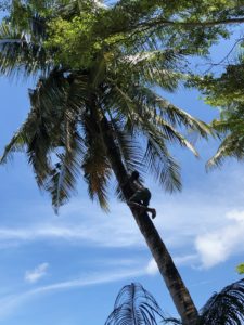 They had been engaged to shimmy up the palms and cut down the coconuts for the sake of safety. The young thin guy was tasked with the difficult job of scaling the trunk in nothing but his trousers and a piece of rag binding his feet. It was impressive. he made it look pretty easy and climbed around, high up in the branches cutting down dead branches and coconuts.