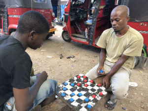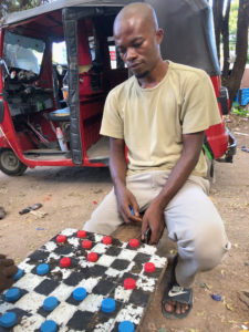 Here is Tanzania, it’s mostly draughts (chequers) and it’s played with a handmade board and red and blue water bottle tops. This week I was on the peninsular looking for a dala dala back home to save a bajaj fare.