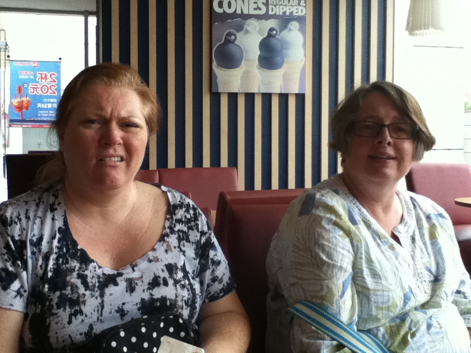 I bought a few books and DVDs and a new large jar of Coffeemate all for £2. I looked around for Sarah and Lynn but they had inadvertently gone and left me! Feelign terrible, they got Sarah’s driver, Michael, to turn around and come and pick me up. Red faces for Lynn and Sarah. But they made up for it and we all went to Dairy Queen where they feasted on ice-cream and me, trying to be less fat, had a smoothie.