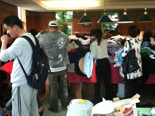 When I went in all I could see was piles and piles of clothes and toys and books and DVDs and all sorts of old games and kitchen stuff. And wading through all this were lots of Chinese people along with a handful of foreigners. Lynn said that when the doors had first opened at 8am there was a huge queue of Chinese outside who pushed to come in and were like locusts picking and tugging and pushing and grabbing at everything.It was like the first day at Harrod’s sale.