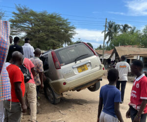In the village of Kimbiji Hans thought he’d pull over to get some water and then drove into a ditch. There was cursing from the front and then a crowd gathered. I climbed out of the car jumped down to the ground and pulled the dog out too.
