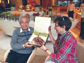 My friend, the mad maths professor Zhemin, and his wife invited me to lunch in a nice hotel in Shanghai on Tuesday. As they they had mentioned Nanjing salted duck several months ago I thought it would be nice to take them one for the Spring Festival. I got it from the market for £2 but unfortunately they just chucked it in a plastic bag and not nice red packaging as is traditional. I got it home and stuffed it in another plastic bag and then in a metal tin and put it on the balcony.