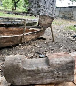 Here you will usually find small boats in various stages of dilapidation and repair. He works mostly with an axe, using it to careful chip away at the new wood to make it flush with the old.