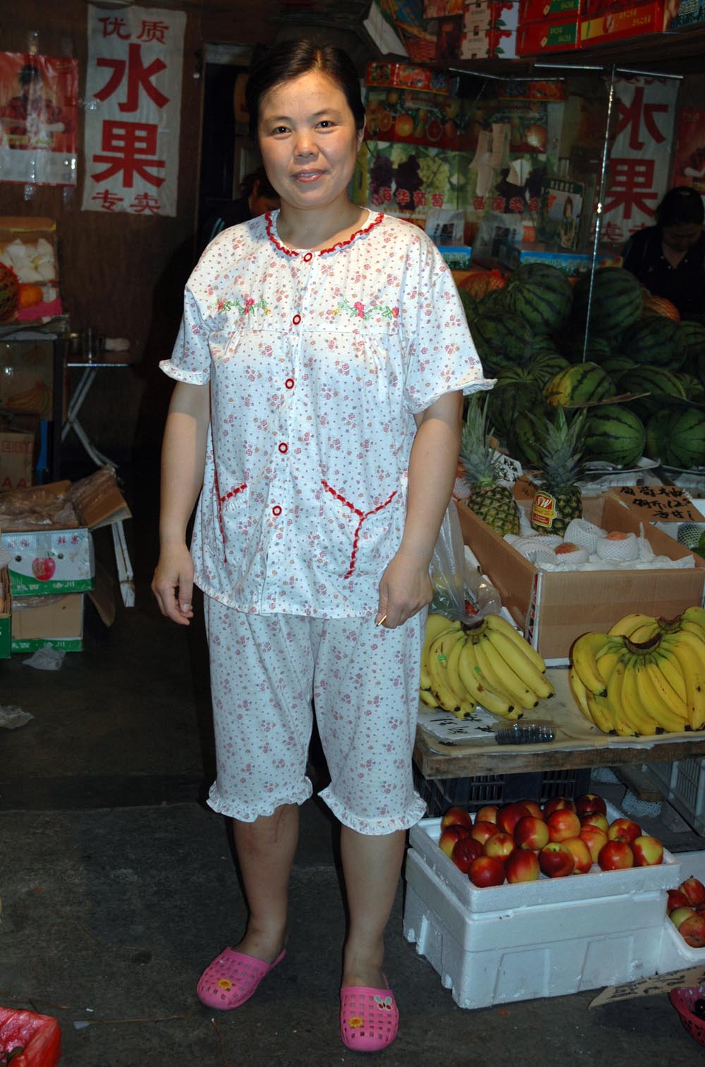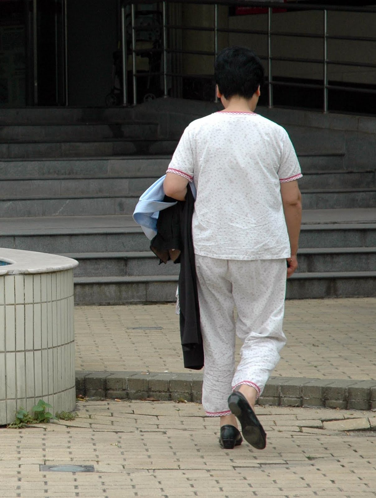 going shopping and down at the subway in their pyjamas. I ventured out with my camera recently and quite quickly found several people wandering around in their pyjamas. I began to wonder why and asked around to see if anyone had any ideas. I found an article in the China Daily newspaper by Raymond Zhou who suggests that this habit has developed out of the cramped housing conditions in which some people live. He believes living in such close quarters helps blur the line between private and public space. Middle-aged women treat their local streets as an extension of their houses and feel comfortable sauntering onto the street in their nightwear.
